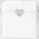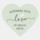 Light sage green, heart shaped stickers with the text "handmade with love" and your custom name. The word "love" is written in an elegant calligraphy script font and the rest of the text in a vintage typewriter style font. Use as envelope seals, stickers for gifts and favours, product packaging etc. Follow us on Facebook: @businessstationery for more products, news, sales and more.