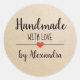 Modern "handmade with love" sticker with a black font on a cardboard background embellished by a cute red heart. Customise text.