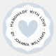 Round stickers featuring a light dusty blue heart surrounded by the text "handmade with love" and your name or other custom text with a light dusty blue, wavy border. Use as stickers for gifts and favours, product packaging etc.