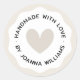 Round stickers featuring a light brown heart surrounded by the text "handmade with love" and your name or other custom text with a light tan, wavy border. Use as stickers for gifts and favours, product packaging etc.