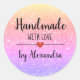 Modern "handmade with love" sticker with a black font on a rainbow glitter background embellished by a cute heart. Customise text.
