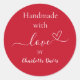 A stylish red background, white text. Personalise and add your name. With the text: Handmade with love, by + a small heart.