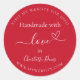 A stylish red background, white text. Personalise and add your name and your website url/link. With the text: Handmade with love, by + a small heart.