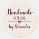 Modern "handmade with love" sticker with a black font on a blush pink background embellished by a cute red heart. Customise text.