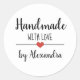 Modern "handmade with love" sticker with a black font on a cardboard background embellished by a cute red heart. Customise text.