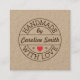 Square arts and crafts business cards. A minimal, elegant design featuring the text "handmade with love" and customisable name as a brown stamp on the front. On the back are customisable template fields for name, title/company name/speciality and contact information. Ideal business card for small businesses and anyone selling handmade goods.