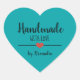 Modern "handmade with love" sticker with a black font on a teal background embellished by a cute red heart. Customise text.