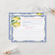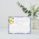 Recipe card design adorned with watercolor lemons, glossy green leaves and vintage blue white text accents to match my bridal shower invitation designs in the same colorway.