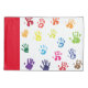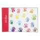 Bright, fun colors of small handprints. Red border on opening side with white letters of your special someone.