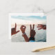 Two people spell "Love" with their hands in front of the ocean and a blue sky, in this lovely photo. Enter your own addressing info on the back. [Photo by Tyler Nix on Unsplash]