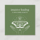 Elegant business cards for psychotherapy studio, energy healing, life guidance, yoga or massage studios, massage therapy, meditation teacher, natural health counsellor, spas or wellness professionals feature a white illustration of a two opened hands creating energy with a spiritual moth a third eye moon and stars in solid moss green colour background.