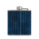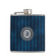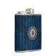 Stylish guy's flask with graphics of a blue on blue striped pattern, with a silver tone metallic looking decorative plaque, on the front. Personalise the blue one letter monogram, in the round plaque, for yourself or as a great gift idea for any guy and especially great as a wedding party gift for groomsmen.