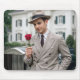 A stylish man in a beige suit and fedora holds a red rose while standing next to a vintage car with a luxurious house in the background
