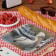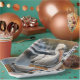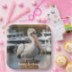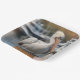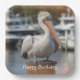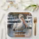 These birthday party paper plates feature a pelican resting on a post at a marina.