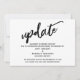 This suite's distinction is due to the modern, handwritten script font used for accent phrases. In the event that you need to let your guests know that your wedding has been cancelled, this card provides a bold, eye-catching option. In this piece, the hand-lettered script font was used to create a simple graphic depicting the word "update". Use the template fields to add your personal details and make this unique, modern design your own. The white background can be changed to any colour you prefer. Please reach out with any special requests or for customising assistance. // 100 //