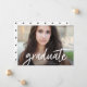 This graduation announcement features the word "graduate" written in a modern white handwritten script. Text fields are fully customisable. Graduation party information can easily be added to the back by deleting the existing background.