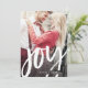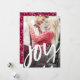 This Christmas holiday photo card features the word "joy" in a modern white handwritten script. Your photo is displayed behind. The back is a crimson and white snowflake pattern but colour can be changed using the customisation tool. Select one from the palette or use your own hex number. Graphics ©Prettygrafikdesign