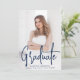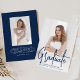 Modern graduation announcement featuring your vertical photo on the front with "Graduate" displayed in a handwritten navy script overlay. Personalise the front of the photo graduation announcement with the graduate's name, school name, and graduation year. The simple graduation announcement reverses to display an additional photo with space provided to include the graduate's plans, graduation details, etc. The 2 photo graduation announcement is perfect for both high school and college graduations!