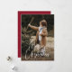 Modern holiday photo cards featuring your vertical photo with "Merry Christmas" displayed in a white handwritten script. Personalise the photo Christmas card with your family name and the year. The single photo holiday card reverses to display a burgundy background with subtle white dots.