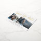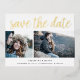 A modern save the date postcard designed to accommodate two of your favourite engagement photos. "Save the date" appears above your photos in gold foil handwritten style script lettering, with your names, wedding date and wedding location beneath.