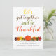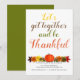 Handwritten typography pumpkin leaves Thanksgiving Invitation. It features the text "Let's get together and be thankful" and a row with pumpkin, leaves an acorns in fall colours.
