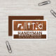 Design features an upper wood layer that has an array of handyman tools. The tools can represent some of the services that you offer. Just below this in a white layer, is the business name "HANDYMAN" (in dark brown) which you can change. At the lower dark brown layer stand your prestigious name and contact details in white that corresponds with the upper white layer.