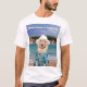 A shirt with a 90 lb. yellow Lab, in a Hawaiian shirt, on a tropical beach. You can customise the text or delete it. You could delete the hang loose sign if you wish. The beach background is a publicdomainpicture.