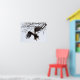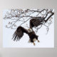 A bald eagle seems to be suspended as it takes flight.