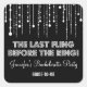It's the last fling before the ring so celebrate in style and get the girls together with this fun bachelorette party sticker. A row of sparkling fairy lights hang from the top of this sticker with the text "The last fling before the ring!" underneath. Add a name, event, wedding party role or any other information against the rich black background. Available in alternate colours with matching products.