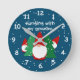 Hanging with my gnomies funny Christmas wall clock. Personalised clock with cute Holiday cartoon drawing. Customisable background colour. Fun Xmas decoration gift idea for kitchen, office and other rooms. Square or round version. Add your custom quote or name. Chilling red trolls illustration with green Christmas trees and snow.
