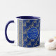 First Candle of Hanukkah. Happy Hanukkah Festival of lights party decoration beauty Jewish holiday gold ornaments design. Vintage Jewish Holiday Chanukkah Navy blue background with traditional Chanukah decorative symbols decor - Gold hanukkiah - menorah, candles, star of David and glowing lights wallpaper gold hanukkiah, wooden dreidels (spinning top toy) with Hebrew letters, donuts, navy blue pattern. Hanukkah festival of lights Family, Friends, Kids event decoration, gifts idea. Jerusalem, Israel. Home & Living > Kitchen & Dining > Drinkware > Mugs & Cups Trendy Design with text template. Personalize them by adding name or wishes text. Modern design. Customize