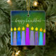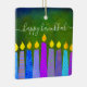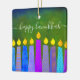 “Happy Hanukkah.” A playful, modern, artsy illustration of boho pattern candles helps you usher in the holiday of Hanukkah in style. Assorted blue candles with colorful faux foil patterns overlay a rich, deep green textured background. On the back, personalize with your family name and year, over a tiny dark green Star of David pattern and background. Feel the warmth and joy of the holiday season whenever you hang up this stunning, colorful Hanukkah custom keepsake ornament. Matching cards, envelopes, wrapping paper, mugs, blankets, serving trays, home décor, and more are also available. A great gift for someone special, even yourself!