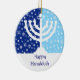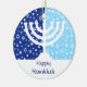 The perfect ornament for the interfaith family. A Hanukkah menorah is silhouetted against a field of dark and light blue stars and snowflakes. Your personalised message goes below. Also can be used as fan, light or blind pulls or wall decor. Available with matching products.
