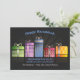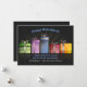 Festive and colourful presents are lined in a row against a dark background. The sentiment "Happy Hanukkah" is preprinted.