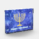 A glowing gold Hanukkah menorah and text reading "Happy Hanukkah" in glowing blue and white superimposed on a blue and white fractal image reminiscent of snowflakes in a storm. Chag Sameach!