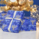 A glowing gold Hanukkah menorah and text reading "Happy Hanukkah" in glowing blue and white text superimposed on a blue and white fractal image reminiscent of snowflakes in a storm. Chag Sameach!