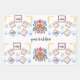 A bright and cheerful design showcasing stamps of a menorah, dreidel, dove and “Happy Hanukkah,” accented with vibrant flowers for a lively holiday touch.