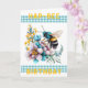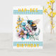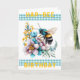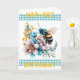 Hap-Bee Birthday Card. A watercolor print of a bee hovering around pretty flowers. A turquoise gingham strip both above and below the main image, with the words 'Hap-Bee' Birthday' in a dark yellow. The main colours are turquoise, yellow and a muted purple. Inside the message reads, "wishing you a wonderful day." This message can be customised to write your own special words.