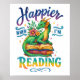 Vibrant, colourful design featuring an open book, colourful dragon, and flowers. The colourful text reads: "Happier when I'm reading". This design is available on a wide variety of products.
