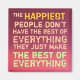 Design by Elizabeth Medina. Copyright. THE HAPPIEST PEOPLE DON'T HAVE THE BEST OF EVERYTHING, THEY JUST MAKE THE BEST OF EVERYTHING. Abstract, Gossip, philosophy. Add your own image and / or words. Change background to any colour. Give as a gift to yourself or a loved one! Great for personal, family events, advertising, humanitarian awareness, environment awareness, promotions or business events! Great for RESALE. The more you order the more you save money! Copyright. Match with other items. **********CustomerService*********If you have any questions or difficulties with an order please call TEL: 1-888-892-9953 in the USA or (408) 983-2800 International. Hours: 8AM to 6PM PST (11am-9pmEST), Monday - Friday. $$$$$$$$COMMISSION$$$$$$$$ You can make 15% commission if you link my store and/or any single product to your store, personal website, facebook, etc. Very easy and FREE! Contact Customer Service. PS: YOU MAY ADD ANY OF MY ART ON YOUR FACEBOOK OR TWITTER OR ANYWHERE ELSE AS LONG AS YOU STATE THAT IS FROM GalleriaofArt.com! (Even better if you link & make money $$) THANKS SO MUCH!