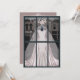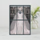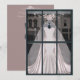 Perfect for any bride with girlish charm and vintage style. A beautiful, barely pink, mermaid wedding gown in a chic vintage store window, the interior of the card pictures the store interior, with the gown and veil having been removed from the dress form and wrapped in large pink boxes with pink bows. Great for the bride, engagement congratulations or wedding related events.