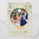 Happily Ever After brushed script newlywed photo luxury first Christmas as Mr and Mrs holiday card with elegant rustic modern sage green and real gold foil greenery and a Christmas ornament shape. Easy to personalise with 2 wedding photos and your text on both sides.