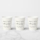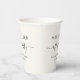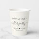 Chic light cream paper cups for your wedding reception and other after wedding parties that feature "Happily Ever After Party" in simple modern typography and a stylish script with swashes, your first names joined by a heart and your reception date.