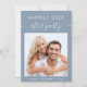 Chic dusty blue post-wedding reception invitation featuring your photo, "Happily Ever After Party" in a blend of simple white lettering and a trendy white script and your first names and wedding or reception date joined together by a heart. Personalise your reception details and add your names in a signature-like script on the back.