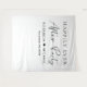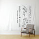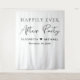 Chic black and white photo backdrop tapestry for your wedding reception or celebration party featuring "Happily Ever After Party" in a mix of simple typography and a modern script and your first names and reception date. You can change the colours of the text, heart and background by editing in the design tool.