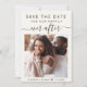 Chic cream wedding save the date announcement featuring your photo, "Save The Date For Our Happily Ever After" in a mix of simple typography and a chic swash script and your first names and wedding date joined together by a heart. On the back, personalise your save the date details and add your names in a signature-like script.