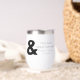 This stemless wine tumbler features a large ampersand text that reads, “They lived happily ever after”. The design makes this a great gift for a wedding or anniversary.