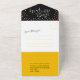 The happily ever after wedding party with a tear-off RSVP in contrasting black and white with bright yellow, coral, aqua, and hot pink. Invitation reads The happily ever after party. Bold graphic contemporary design, personalise with your own wedding after-party belated wedding venue, brides and grooms names and reply details, and your favourite wedding photo from your wedding day on the inside flap and request via your rsvp guest information for a song to play and dietary requirements or change to your own optional details. Ideal for postponed wedding parties. This design requires no extra envelopes and has a detachable perforated RSVP that you can add your return address to for easy replies. Matching wedding products and other colour options available in the store. © Design by Sarah Trett for www.mylittleedenweddings.com