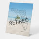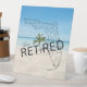 Celebrate the best years of your life with this beautiful retirement themed pedestal sign. The design features a Florida state map with the saying, "Happily Retired." A tropical palm tree replaces the letter "i" in retired! The background is a gorgeous tropical beach scene. Available in various size options. The tabletop sign is perfect for a retirement party gift, gift for Grandparent's, senior citizens, snowbirds, or anyone enjoying retirement in the Sunshine State! Please browse our complete collection of tropical-themed retirement cards, gifts, t-shirts, home decor, and more. Special design requests accepted.