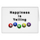 The text says "Happiness is yelling BINGO" The word bingo is spelled out on 3D bingo balls with a different coloured ball for each letter. B is red, I is blue, N is green, G is yellow, and O is purple. Got a Bingo lover in your life. This is the perfect gift for them.